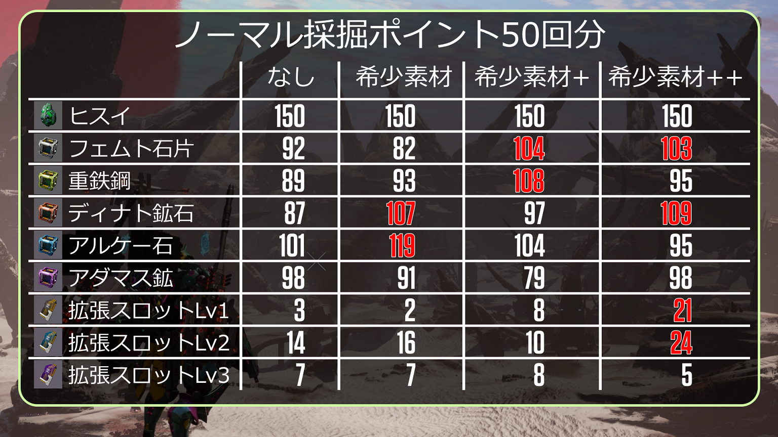 また、拡張スロットメモリーのLv1、Lv2は「希少素材++」が倍以上入手できていますが、